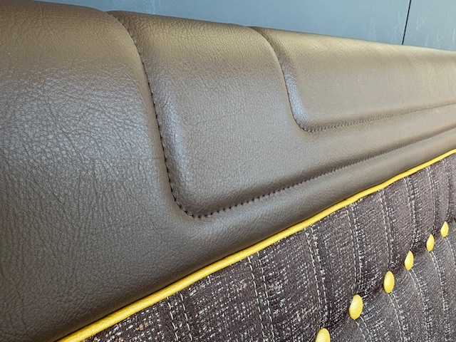 | 施工内容 | 茶色のレザーとファブリックを使い純正とは違ったオリジナルのシートパターンで張り替え。 アクセントに金色のレザーでパイピングと背面にボタンを付けました。 |