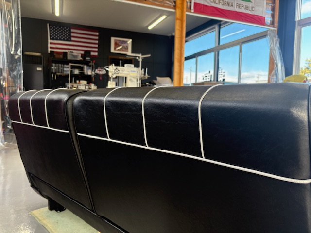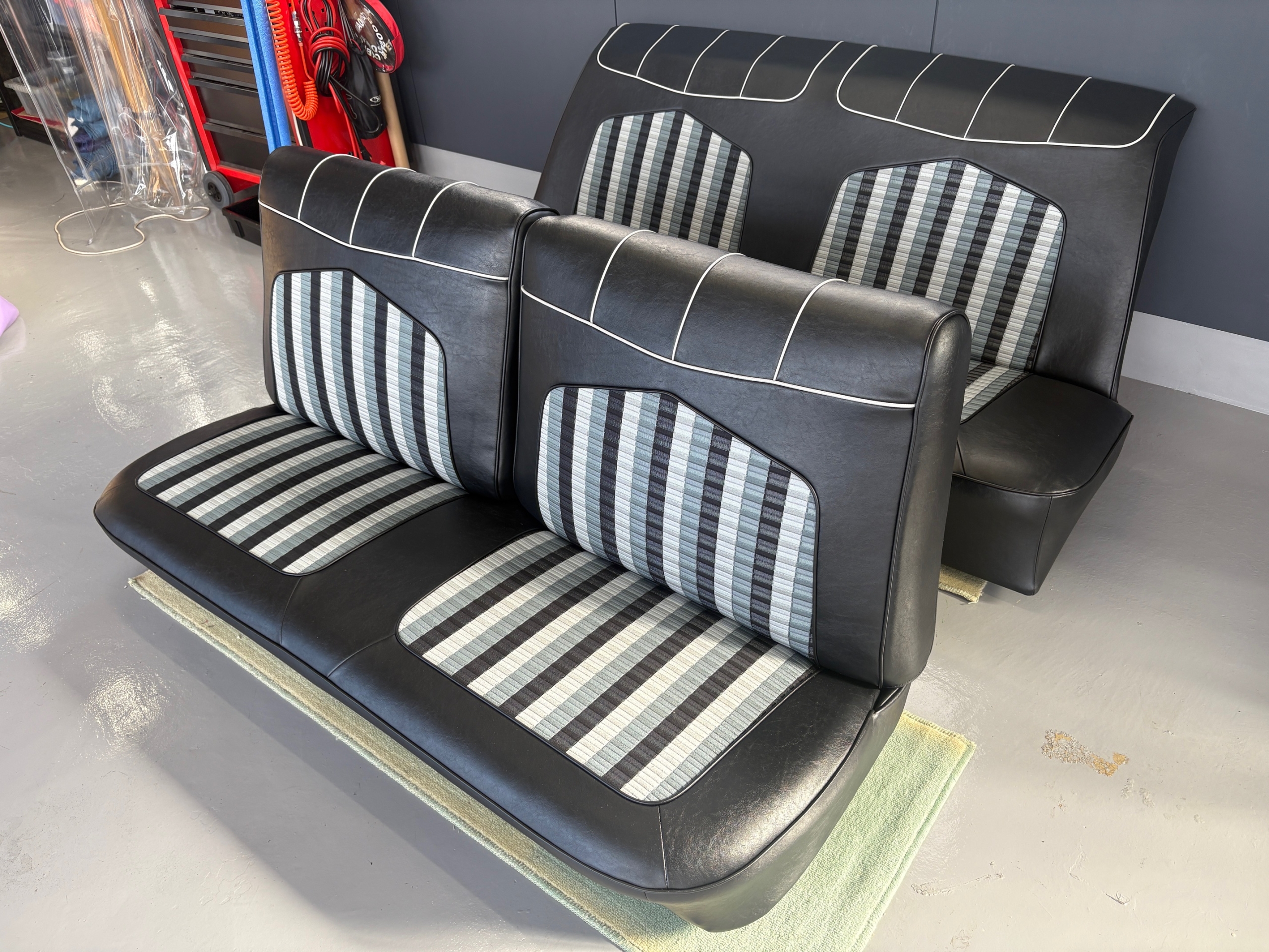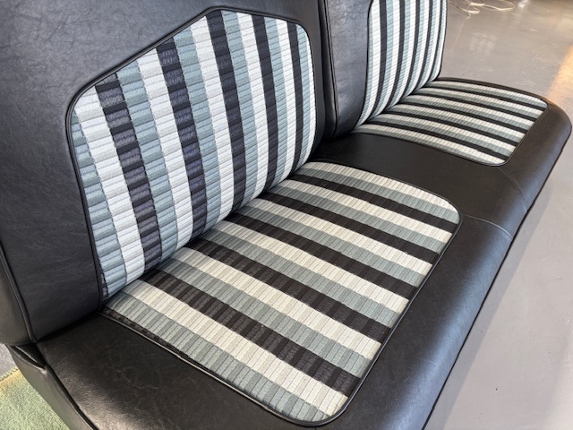| 施工内容 | ビニールレザーと59年式インパラのオリジナルファブリックを使って張り替え。 フロントシートのデザインは当時の純正デザインを再現し、リアシートはフロントに合わせてセパレートなデザインにしました。 背面上部は純正ではメッキですが、シルバーのパイピングで再現しています。 |