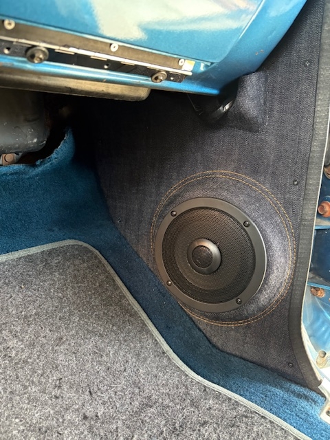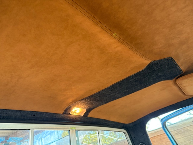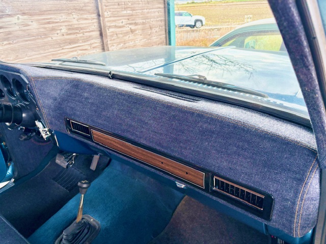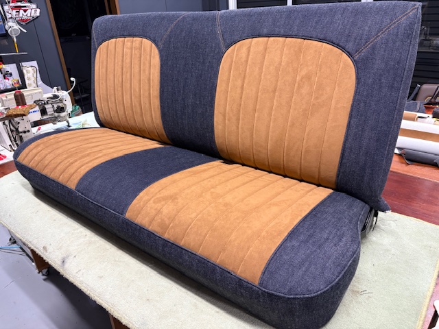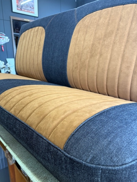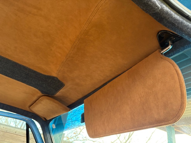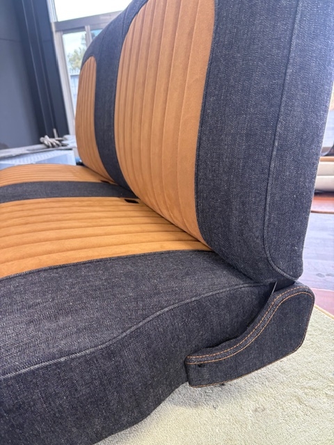 | 施工内容 | ・シート ・ダッシュボード ・ルーフ ・サンバイザー ・ピラー ・キックパネル シートは張り替える前に背面のフレームとウレタンを加工し、約40mm延長して窓枠の高さに合わせてから張り替え。 ダッシュボード、キックパネルはデニム生地に茶色のダブルステッチを入れました。 ルーフ周りはアルカンターラをメインに、デザインでセンターにデニムを使いました。 |
